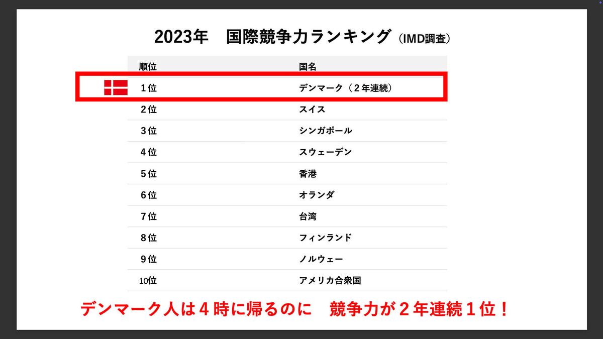 この国際競争力やビジネス効率性こそ、私が本を書いた理由です。デンマークは2022年・2023年に国際競争力ランキングで2年連続1位になりました。