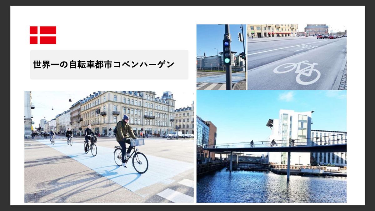 また、コペンハーゲンは世界1位の自転車都市です。環境対策として自動車を減らし、自転車を増やそうという取り組みが行われてきました。自転車利用は環境だけでなく国民の健康にもつながるため、インフラ整備も進められています。右下の写真にあるように、自転車専用の橋なども整備され、通勤・通学で自転車を使う人が非常に多い街です。