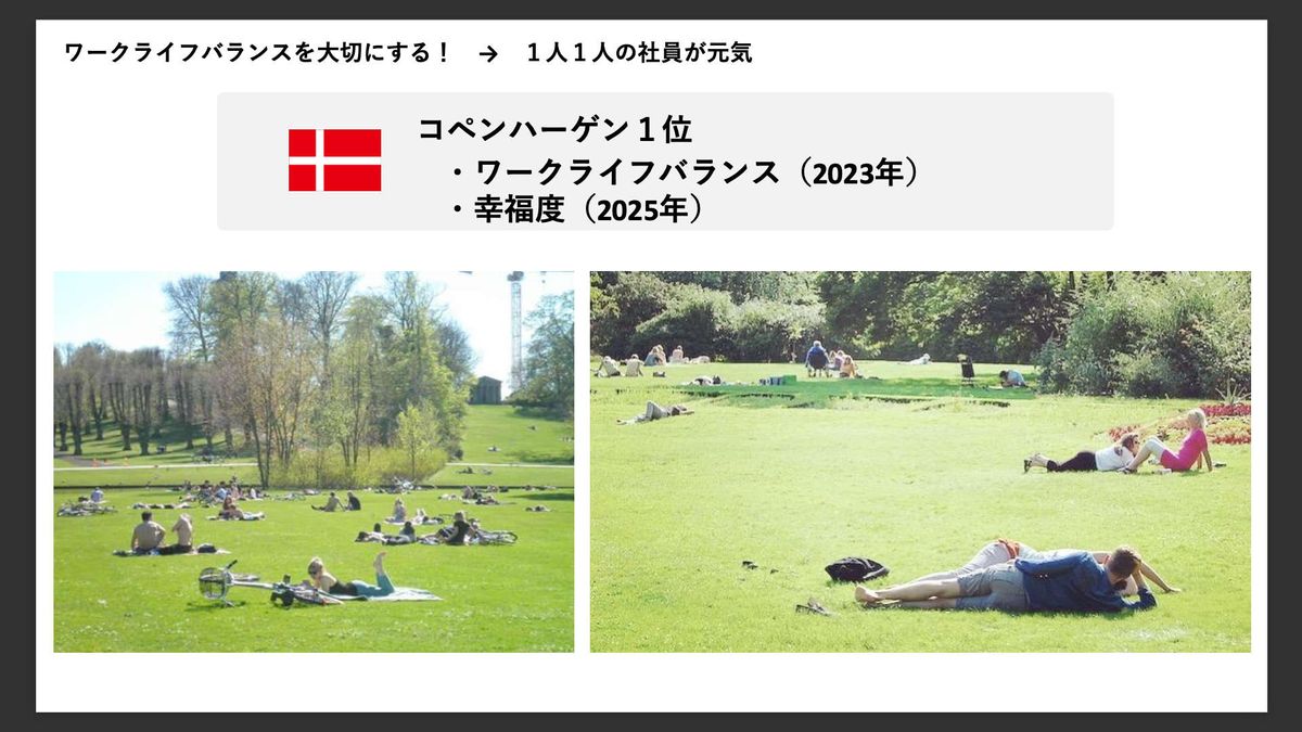 結果としてワークライフバランスを重視しており、首都コペンハーゲンは「ワークライフバランスを実現している都市」世界1位に選ばれました。また2025年には「幸福度が最も高い都市」としても評価されています。