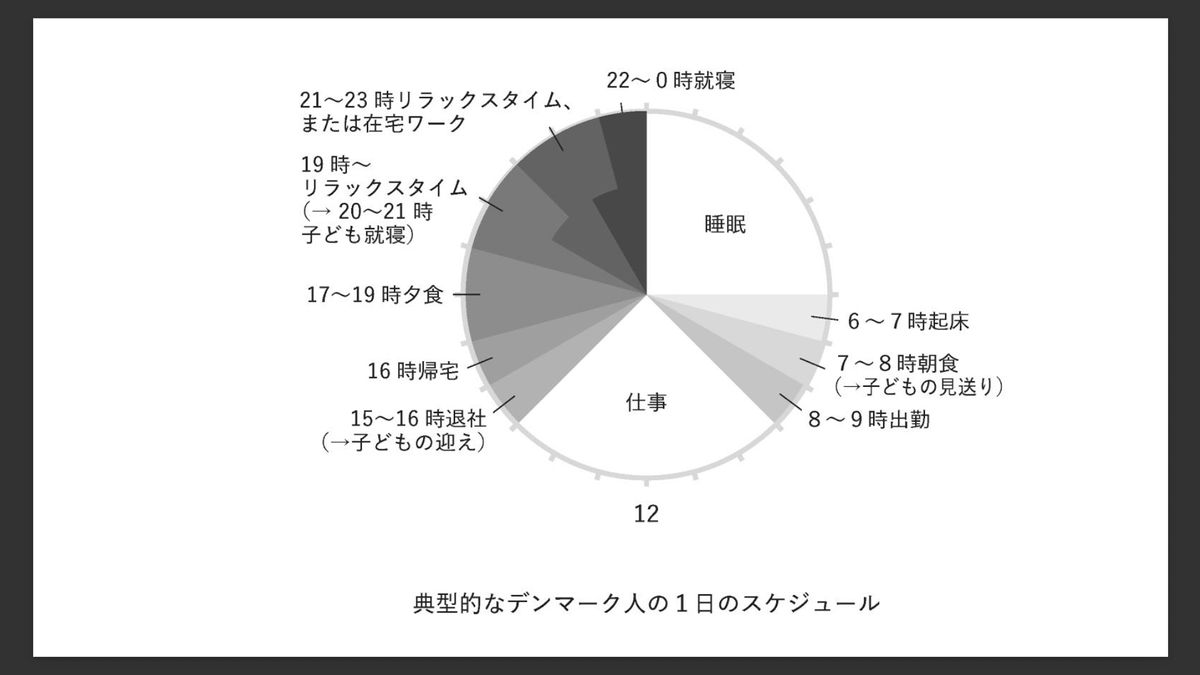 朝は8時から9時に出勤し、午後3時から4時頃に退社。子どもがいる人は迎えに行き、夕方にプライベートタイムを過ごします。家族で夕食を囲むのが日常です。その後は仕事を終える人が多いですが、管理職などでは子どもが寝てから少しメール処理や翌日の準備をすることもあります。翌朝に回す人もいます。「デンマーク人も残業しているじゃないか」と言われることがありますが、ポイントはプライベートを犠牲にしないことです。
