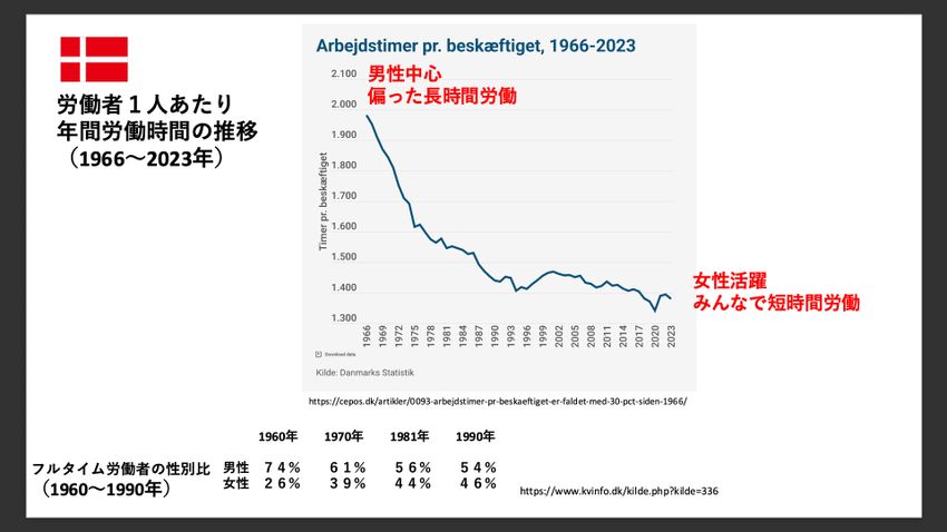 ただし、昔からそうだったわけではありません。これは日本人にとって励みになると思いますが、デンマークもかつては男性中心で偏った長時間労働の国でした。1960年代から現在までを振り返ると、当時は男性が長時間労働を担っていたのが、徐々に労働時間が短縮され、女性の社会進出が進み、今では男女を問わず国民全体で短時間労働を実現しているのです。
