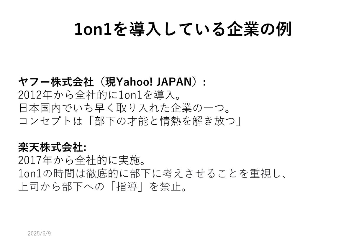 じゃあ、どんな企業が1on1を導入しているのかというと、ここはもうかなり有名なんですけども、やはりヤフーさん(現在はLINEヤフー株式会社)ですよね。