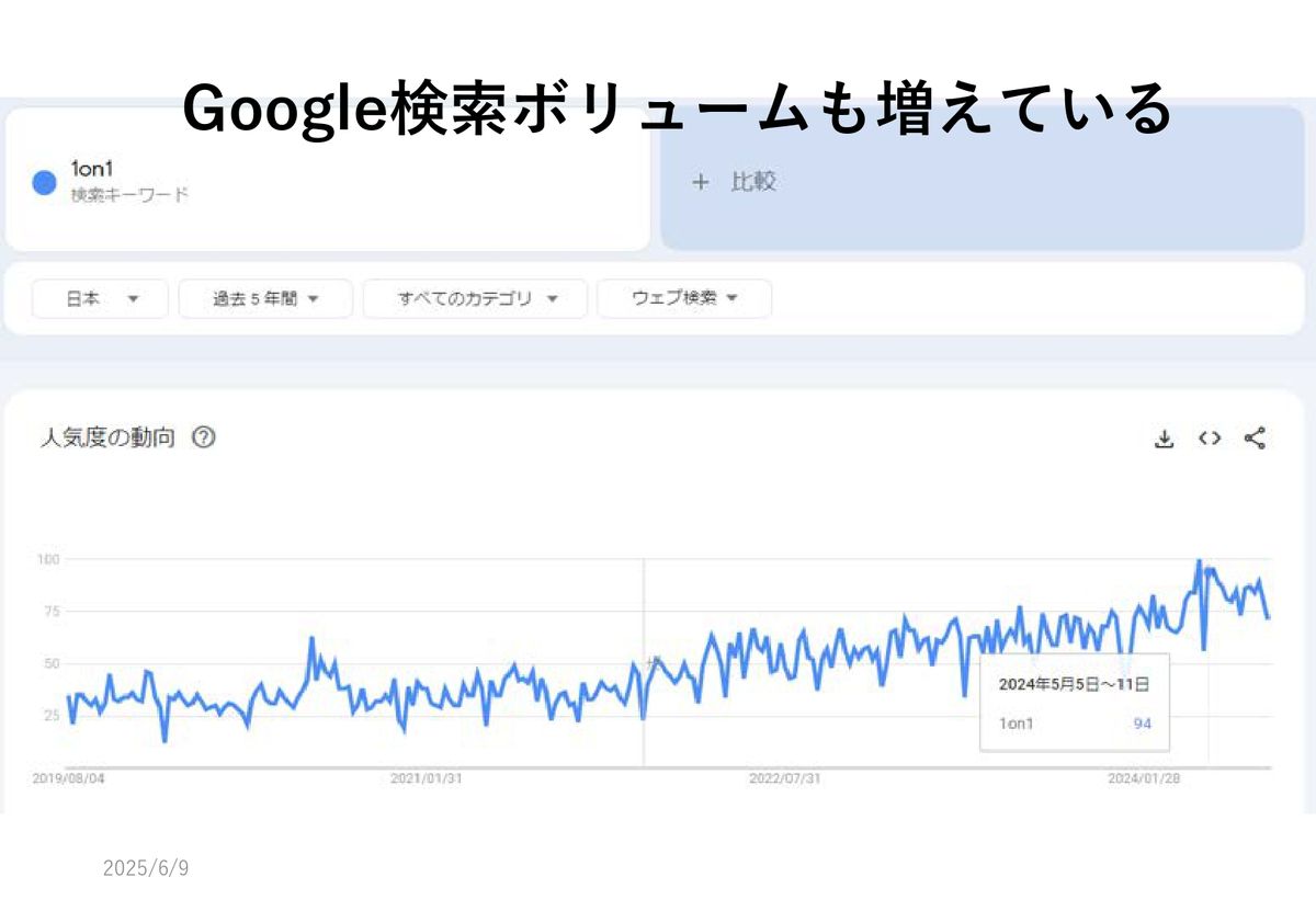 見方としては、2024年の5月ぐらいを100、一番検索された状態だとした時に、2019年だと約4分の1ぐらいの検索ボリュームだった。それだけ1on1に対する注目も高まってきていることがデータとしても言えることをご紹介させてください。