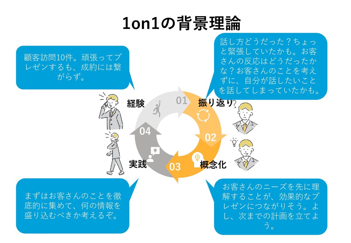 それは経験、振り返り、概念化、実践の4つのプロセスです。この振り返りと概念化が1人ではなかなか難しい部分で、1on1で定期的にやっていくのがポイントになります。