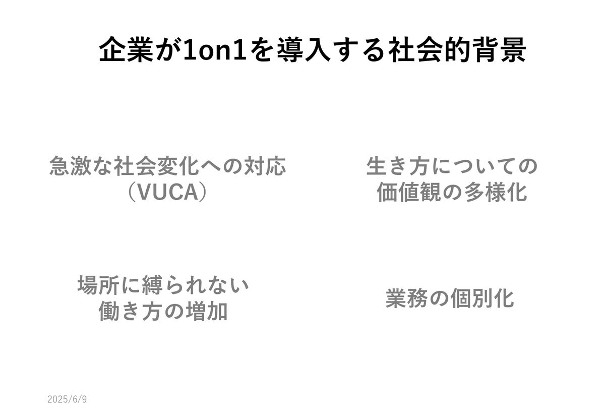 ということは、上司として何が必要なのか。その部下を深く理解して、一人ひとりに合った成長の支援をしていくこと。こういった文脈の中で、上司と部下の対話の機会である1on1が増えてきたところがあります。