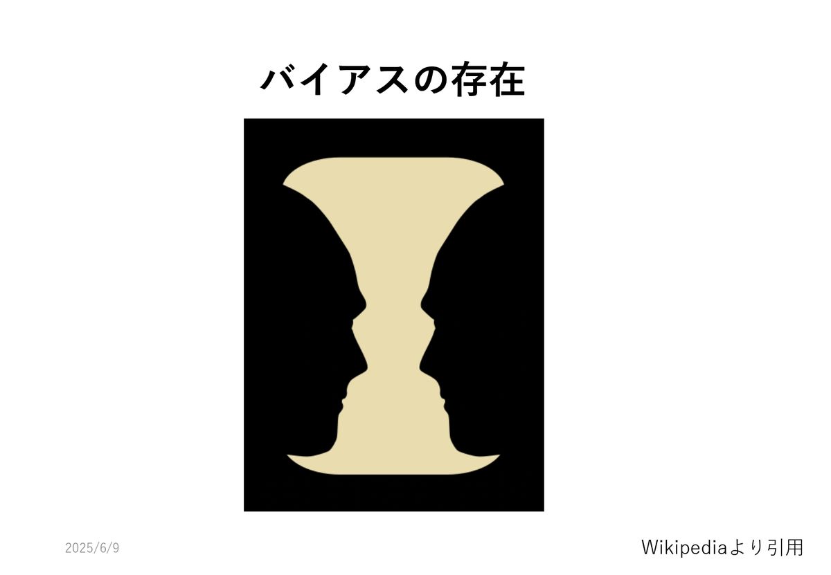 じゃあ、この「考える」ことがポイントだとした時に、1人で考えるのはけっこう難しい。それにはいくつかの背景があるんですが、例えばバイアスの存在。さぁ、これ(スライドに「ルビンの壺」の絵を表示)は何に見えますか? ちょっと今日は問いを交えて、みなさんにも頭を働かせてもらえたらと思います。