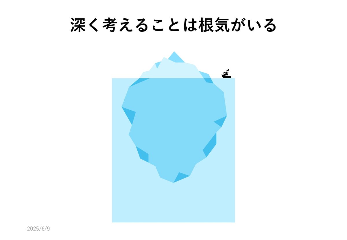 ほかにも、深く考えることは根気が要る。深く考えるとはどういうことか、「氷山モデル」をご紹介したいと思います。