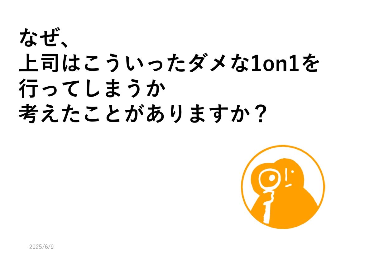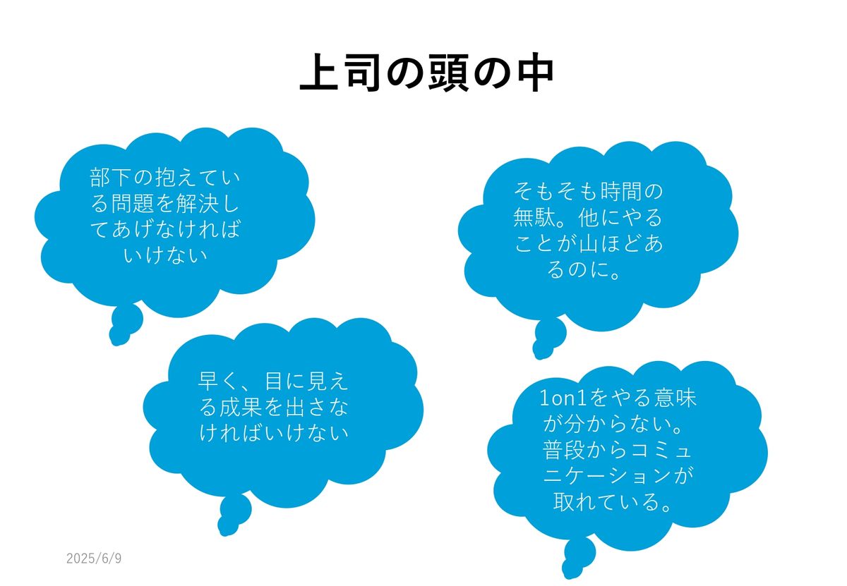 これはもちろん業界にもよると思うんですけど、特にヒエラルキー。上司が答えを持っていて、部下がそれを聞くんだというコミュニケーションがずっと続いてきた業界や企業だと、1on1をやっても、これまで築き上げてきたスタンスがあるので、先ほどみたいになってしまう。