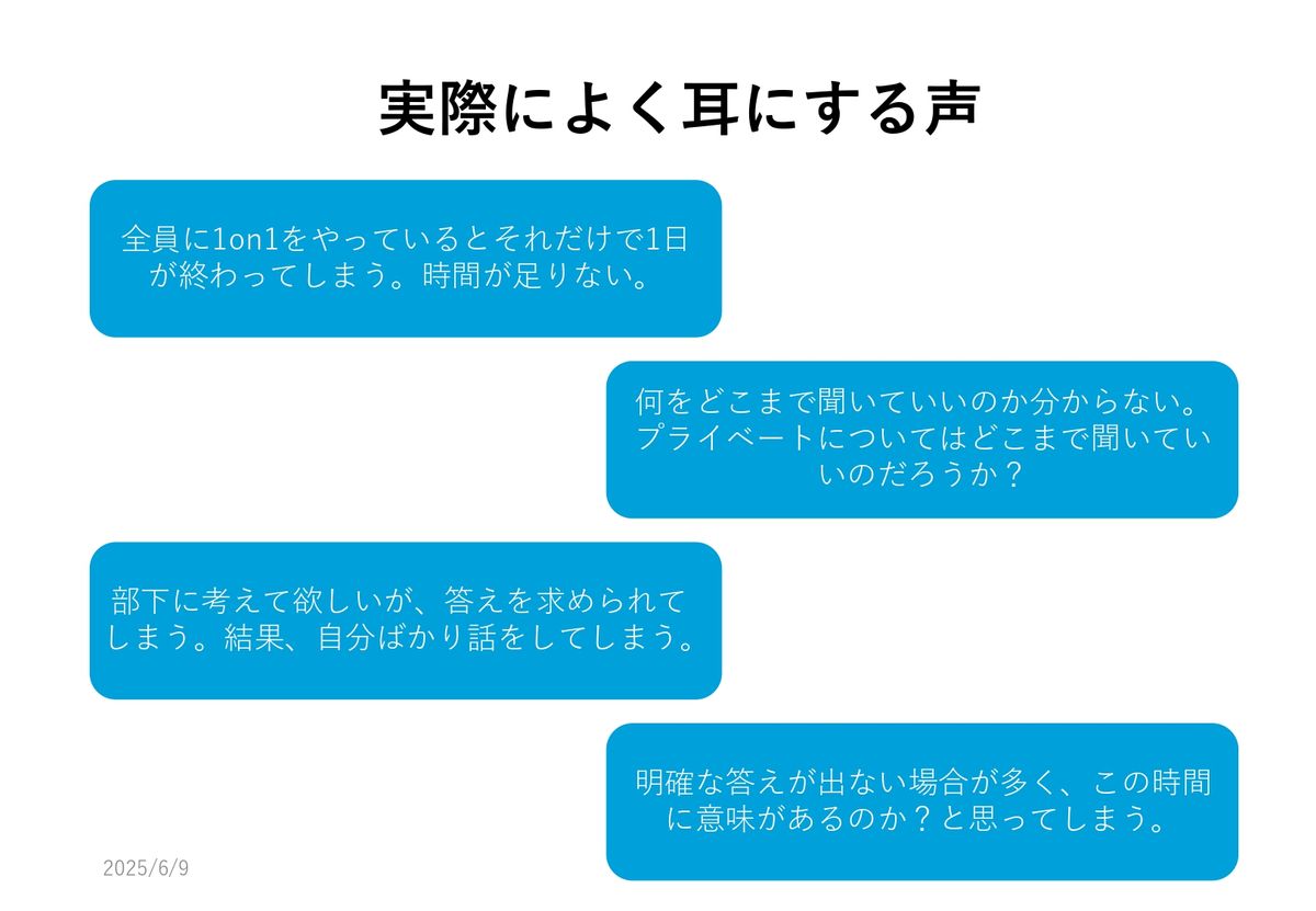 実際に、ご相談でこんな声をよく聞きます。例えば「全員に1on1をやっていると時間がない。それだけで1日が終わってしまう」と。これは業界や部署のニーズにもよると思うんですけど、「部下の人数が20人とかいるんですよ」「無理です」という。