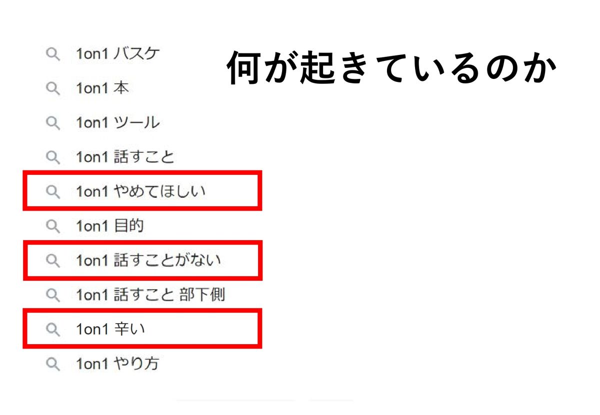 実際、「1on1」でGoogle検索をしてみると、予測入力で「やめてほしい」「話すことがない」「つらい」といった言葉がずらーっと出てきました。これは一般的に検索されている言葉なので、つらいと思っている人が多いのかなと。もしかしたらバスケの1on1のことを言っている人もいるかもしれませんが(笑)。