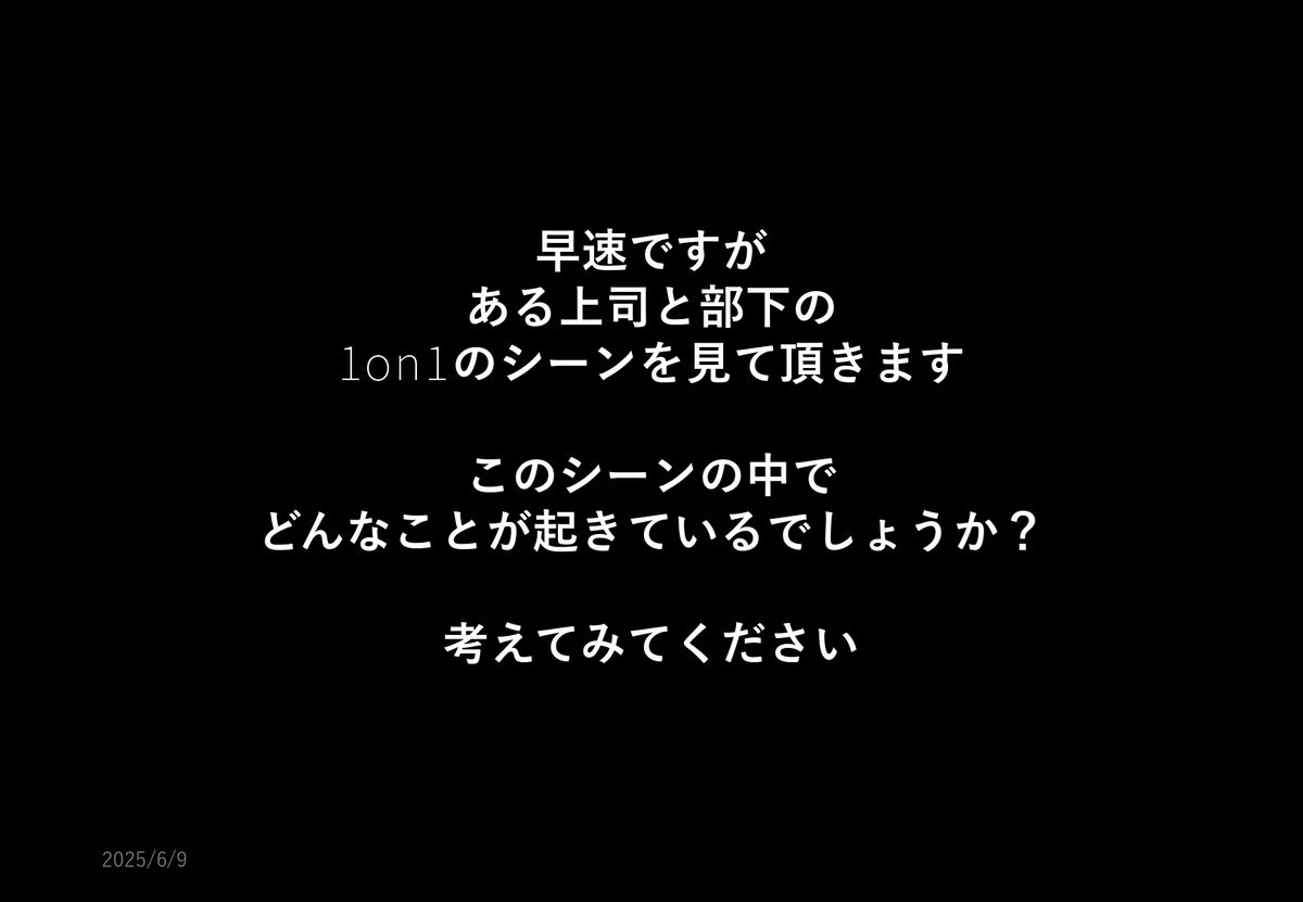 森:じゃあ、ここから、1on1がなかなかうまくいかない状況は、具体的にどんなことがよく起こりがちなのか。その具体のシーンをみなさんに見ていただいて一緒に考えていく。「うーん、何が起こっているんだ?」「何があってそれが起こっているんだ?」「みなさん、職場でもこんなことないですか?」ということを一緒に考えていければと思います。