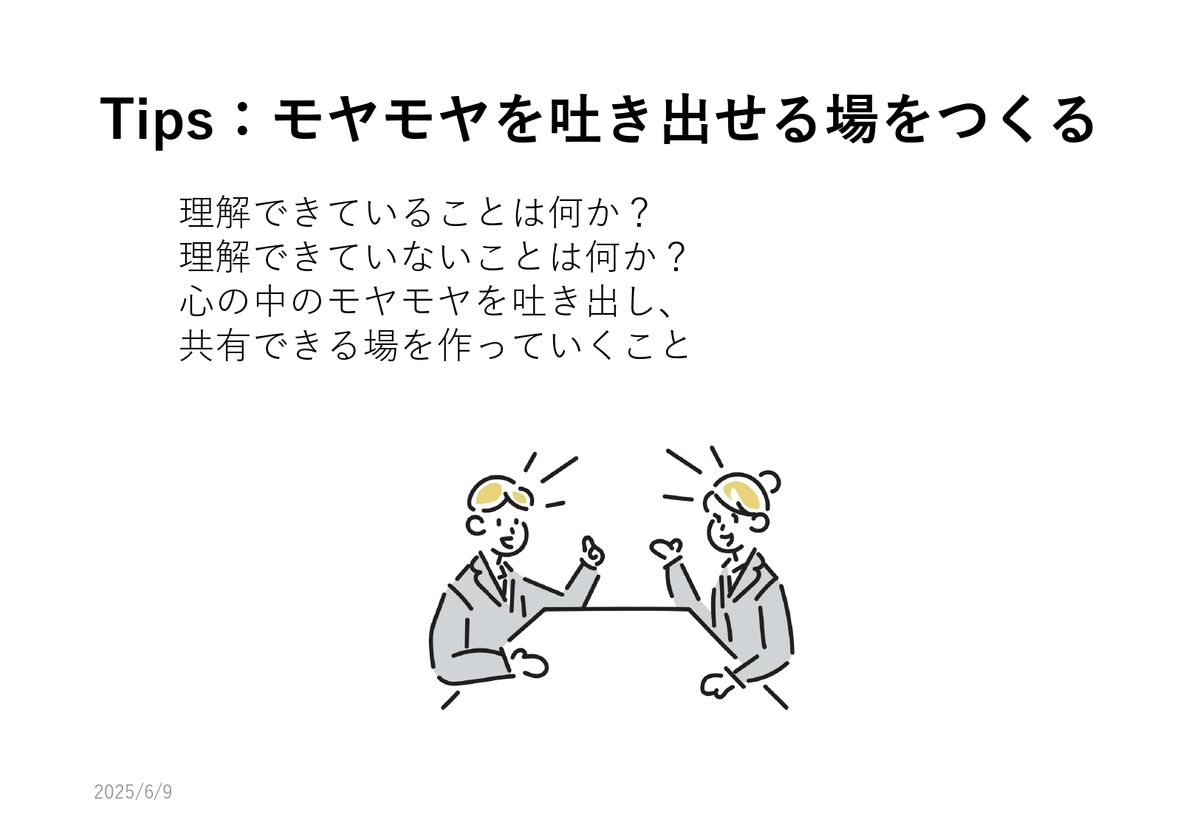 ポイントを2つお伝えします。1つが、モヤモヤを吐き出せる場を作りましょう。こんな目的があるので1on1をやりましょう、ということを上司の方がお伝えしたとしても、「いや、目的はわかるけど、これだけ忙しいのにな」という(部下の)反応が起こってくるので。