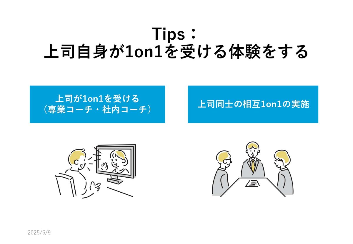 あとは、上司同士の相互1on1をやってみる。1on1を部下に対してやる人同士でお互いにやってみるからこそ、「もうちょっと、こういう聞き方をすればよかったんじゃないか?」とか「あっ、これは良かったね」ということを率直にフィードバックし合えるんです。