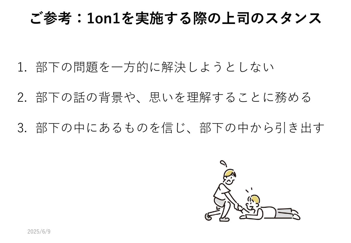 だから、上司自身が1on1や、関わり方を体験する機会を作っていく。これがものすごく大事ですね。