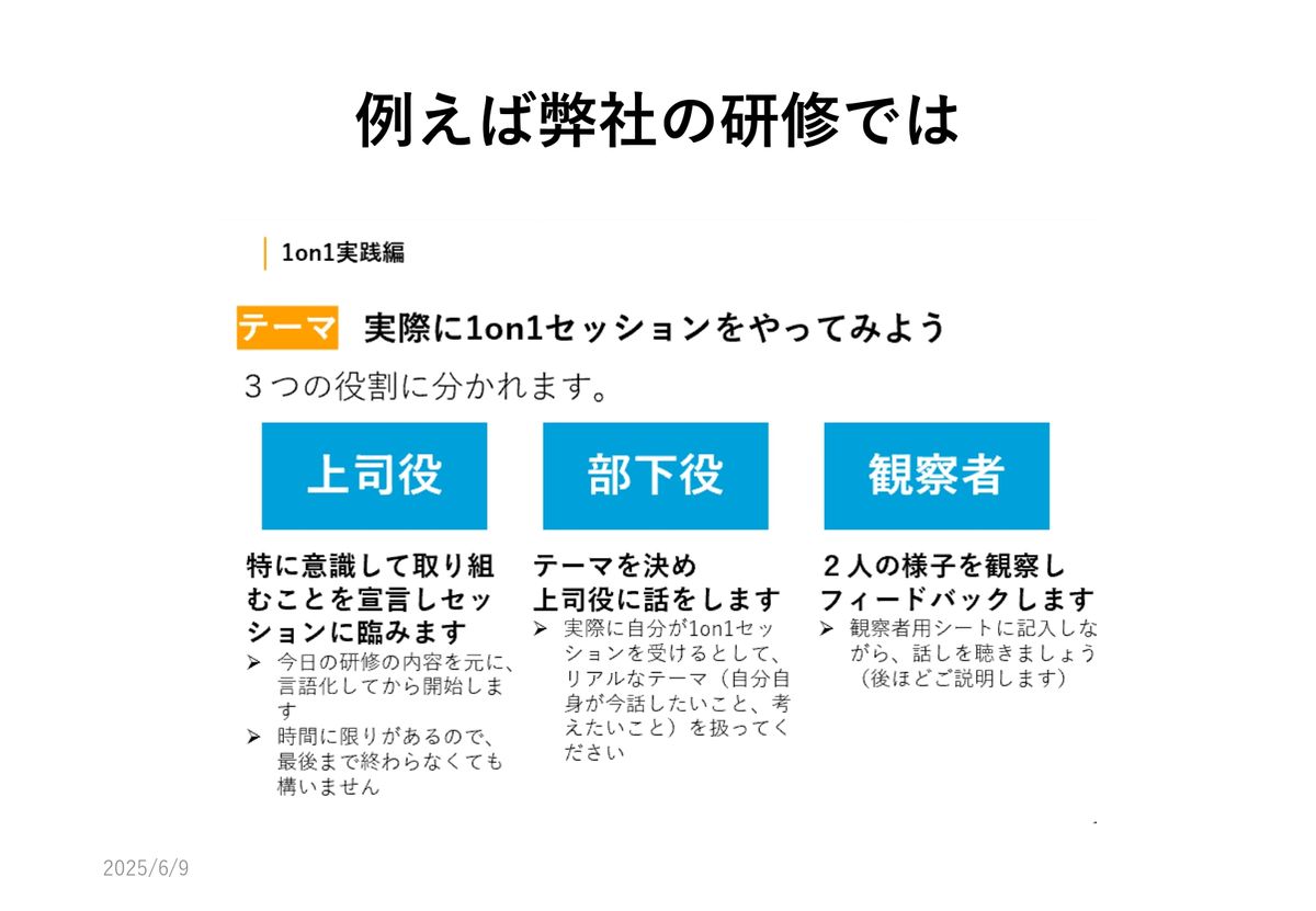 例えば、これは弊社の研修のご紹介なんですけど。実際に上司役、部下役、観察者役と分かれて、お互いに1on1をやってもらいます。