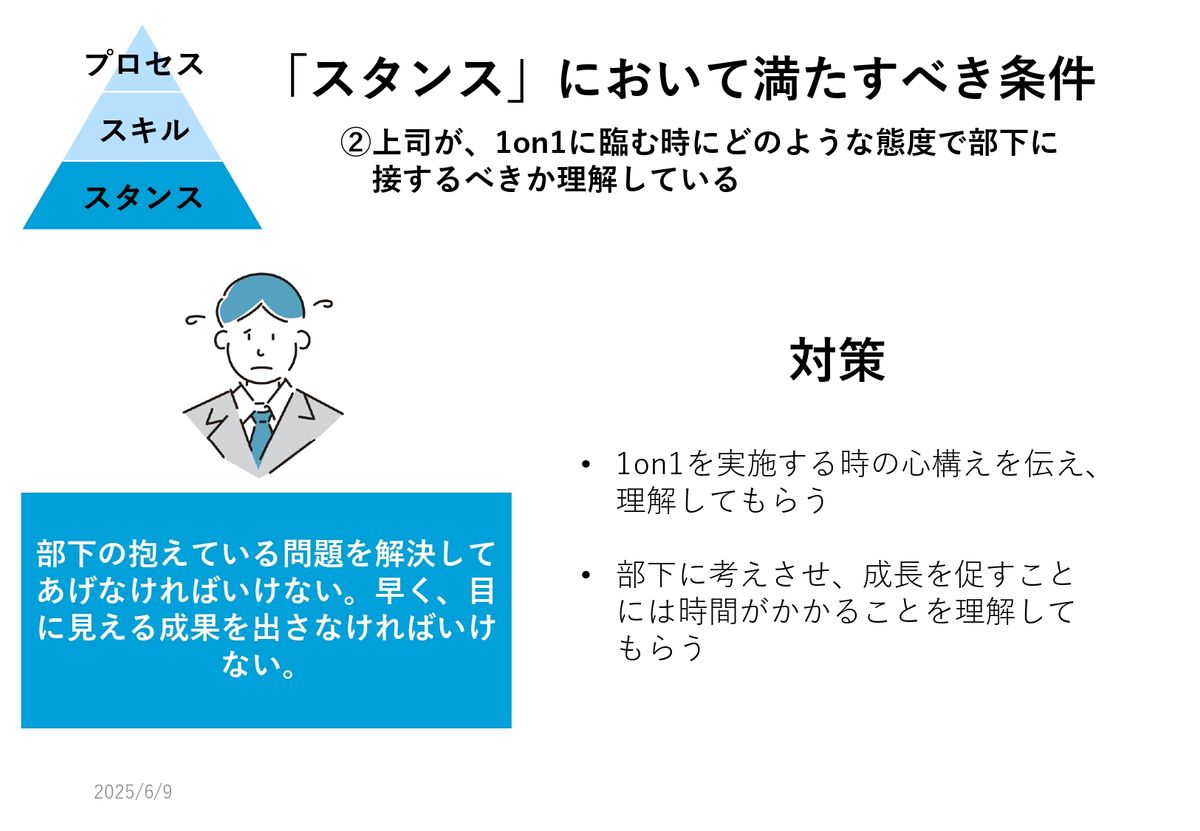 対策としては、1on1を実施する時の心構えを伝えて理解してもらう。あと、そもそも部下に考えてもらうには時間がかかるんだと理解してもらうことが大事です。