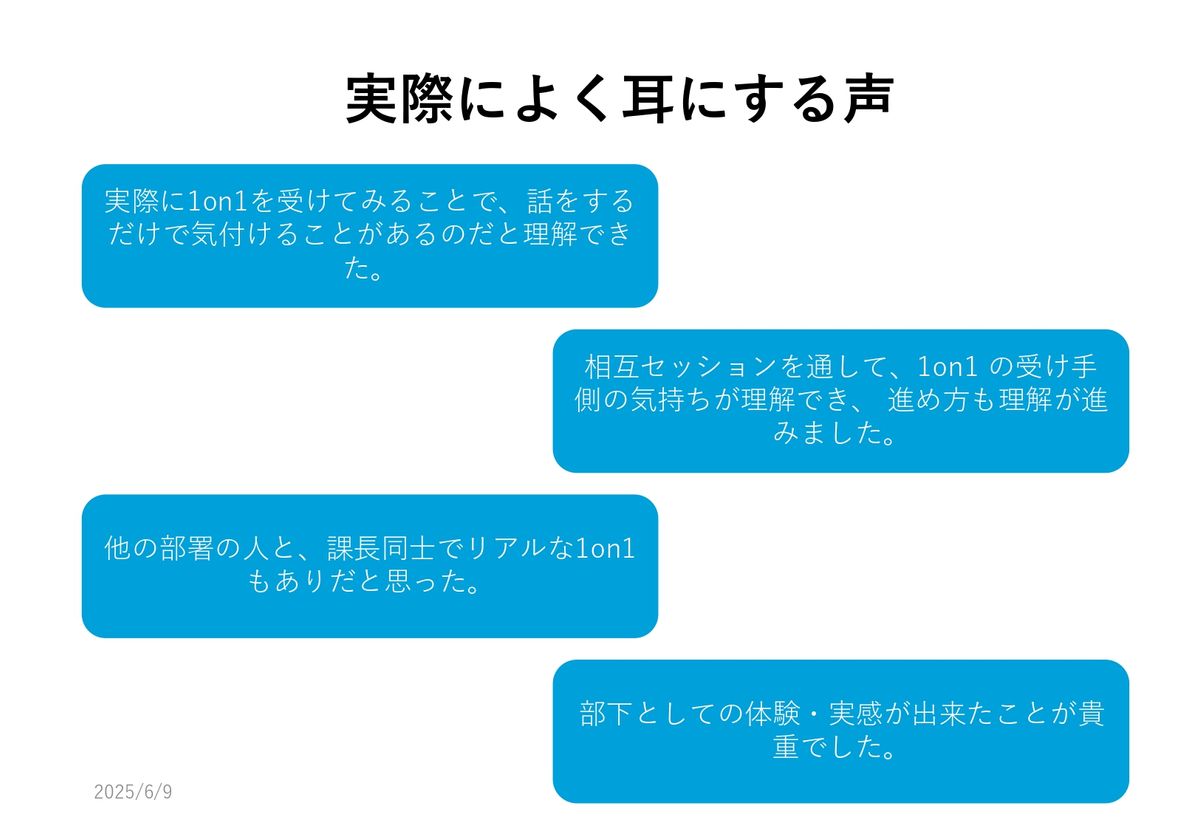 「実際に受けてみると、話をするだけで気づけるんだ」「受け手の気持ちがわかった」「課長同士の1on1もおもしろそうだね」と、実際にこういう声をいただきます。