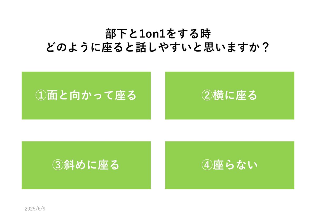さっそくですが出題です。(スライドを示して)1on1を行う際の座り方として、もっとも適切なものは次のうちどれでしょう?