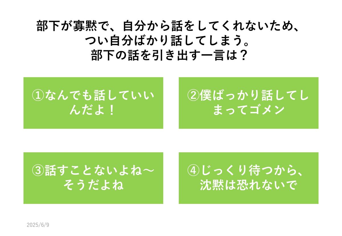 どんどんいきますね。第2問。部下が寡黙で、自分から話をしてくれないため、つい自分ばかり話をしてしまう。部下の話を引き出す一言は何でしょうか?