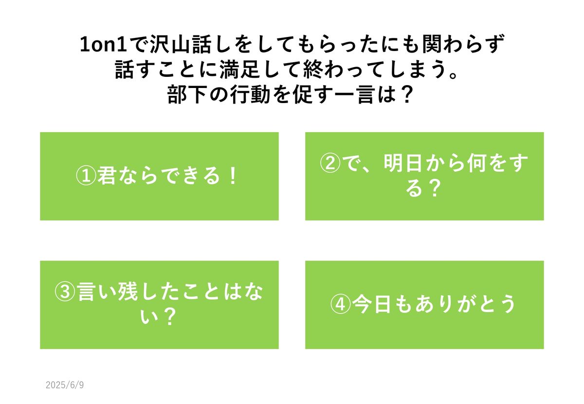さぁ、では次が最後です。第3問。これはよくあるんですよ。1on1でたくさん話をしてもらったにもかかわらず、話すことに満足して終わってしまう。部下の行動を促す一言は何でしょうか?