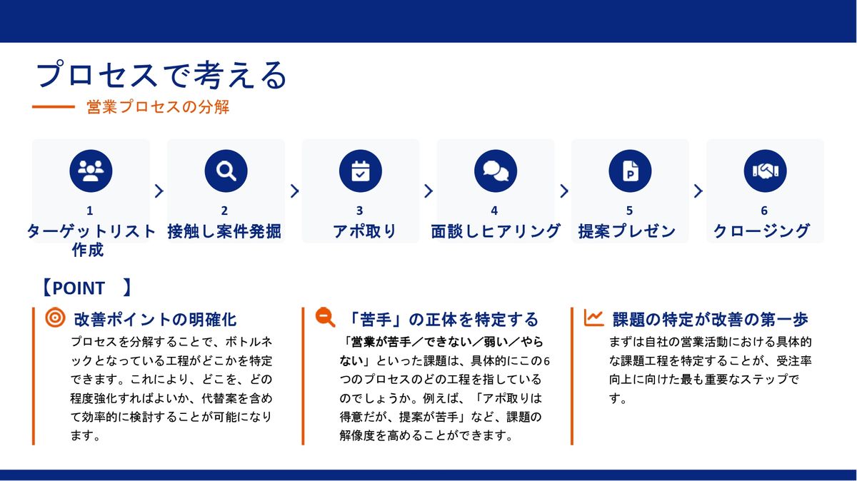 ・営業プロセスを細分化して弱点を特定し、PDCAを回すことで、効率的な営業モデルを構築できます。