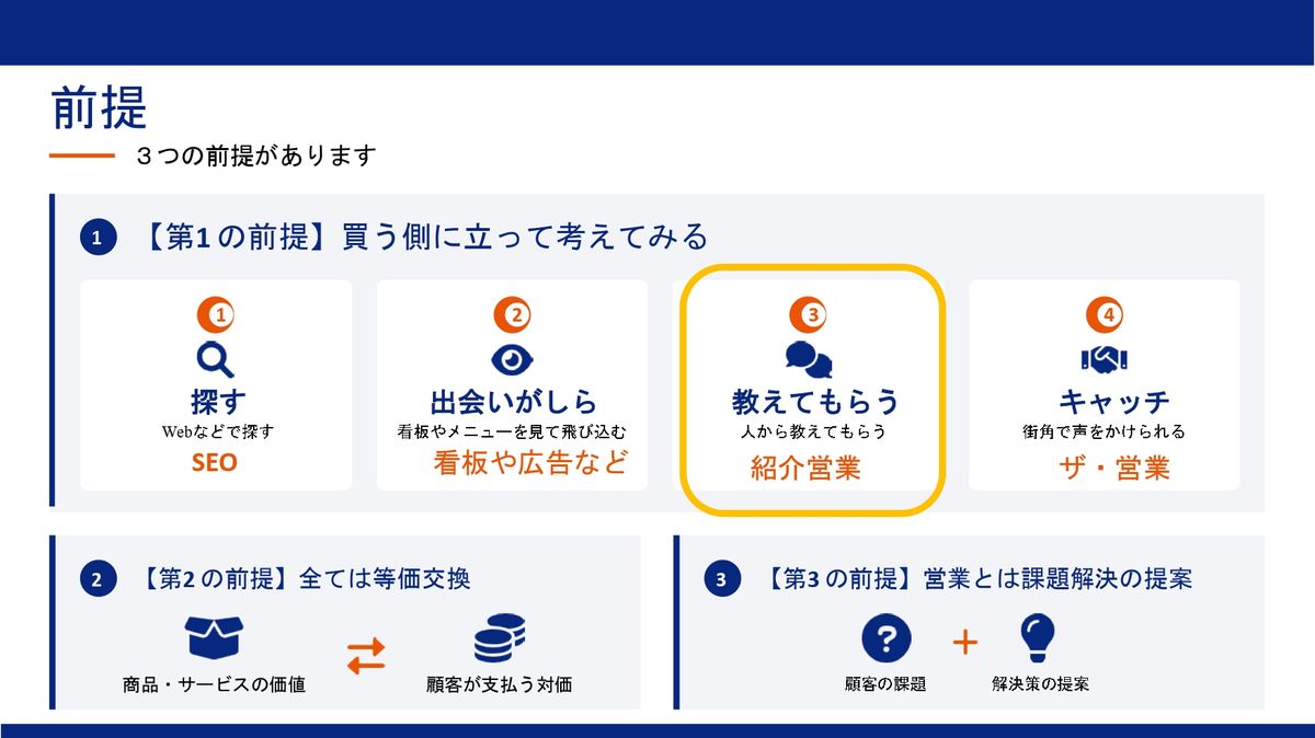 第3の前提としては、「営業とは課題解決の提案」ということです。これも当たり前過ぎるかもしれないんですけども、「顧客の課題は何ですか?」「それをこういうふうにしたら解決できますよ」という提案ができるかどうかですよね。