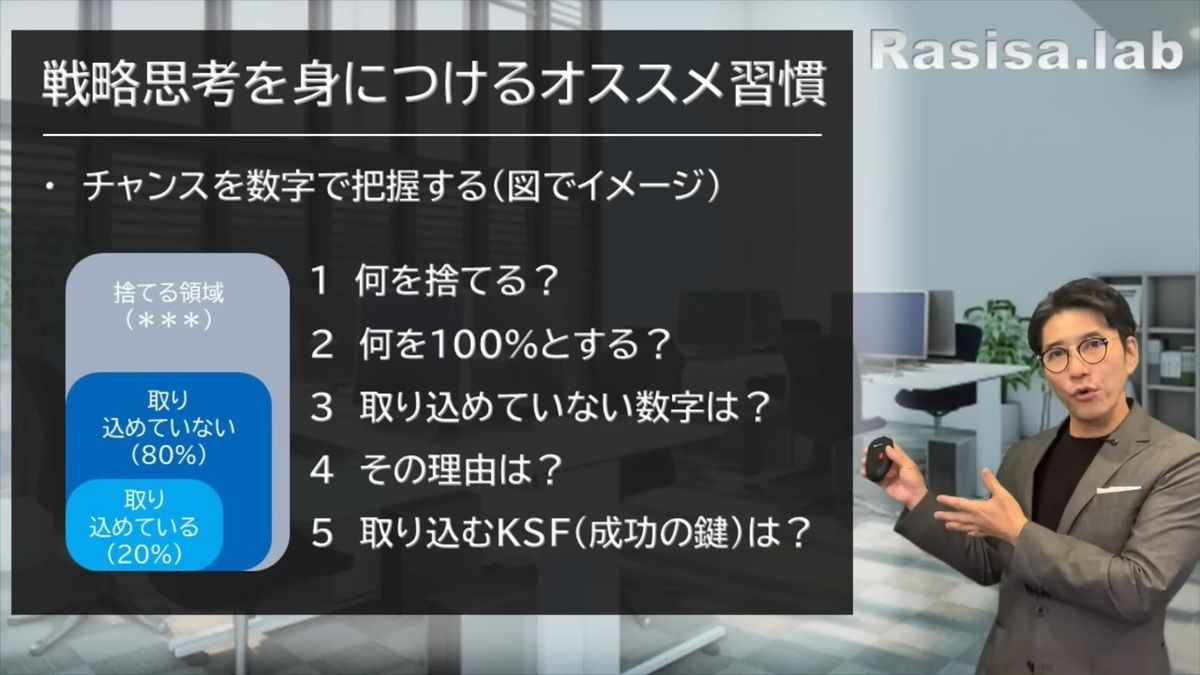 このような流れです。1つ目、何を捨てる? 2つ目、何を100パーセントにする? 3つ目、取り込めていない数字は? 4つ目、その理由は? 5つ目、取り込むためのKey Success Factor何か? このあたりをぜひ押さえておきましょう。これだけで、あなたの戦略習慣は変わります。