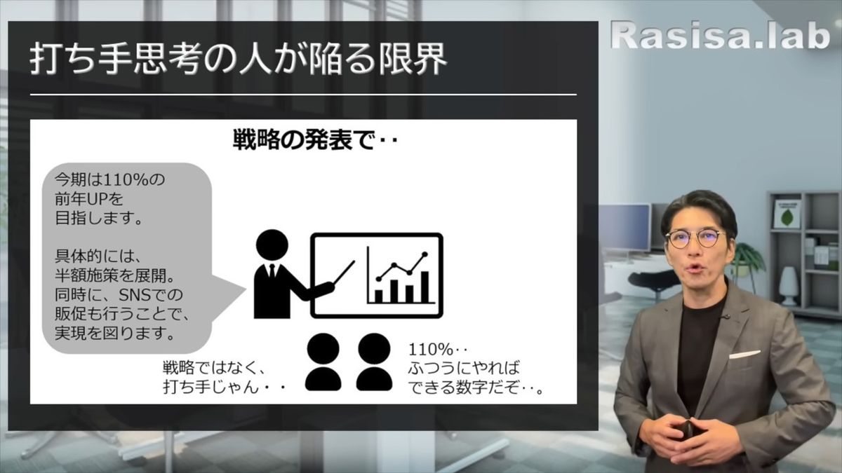 では、さっそくいきましょう。まず打ち手思考の人が陥る限界。例えば、職場の戦略発表の場があったとしましょう。その時に発表者がこう言ったとします。「今期は110パーセントの対前年アップを目指します。具体的には半額施策を展開し、同時にSNS、YouTubeを展開することで、販促を強化していきます。これで110パーセントの実現を目指します」と。