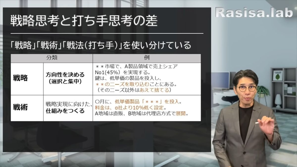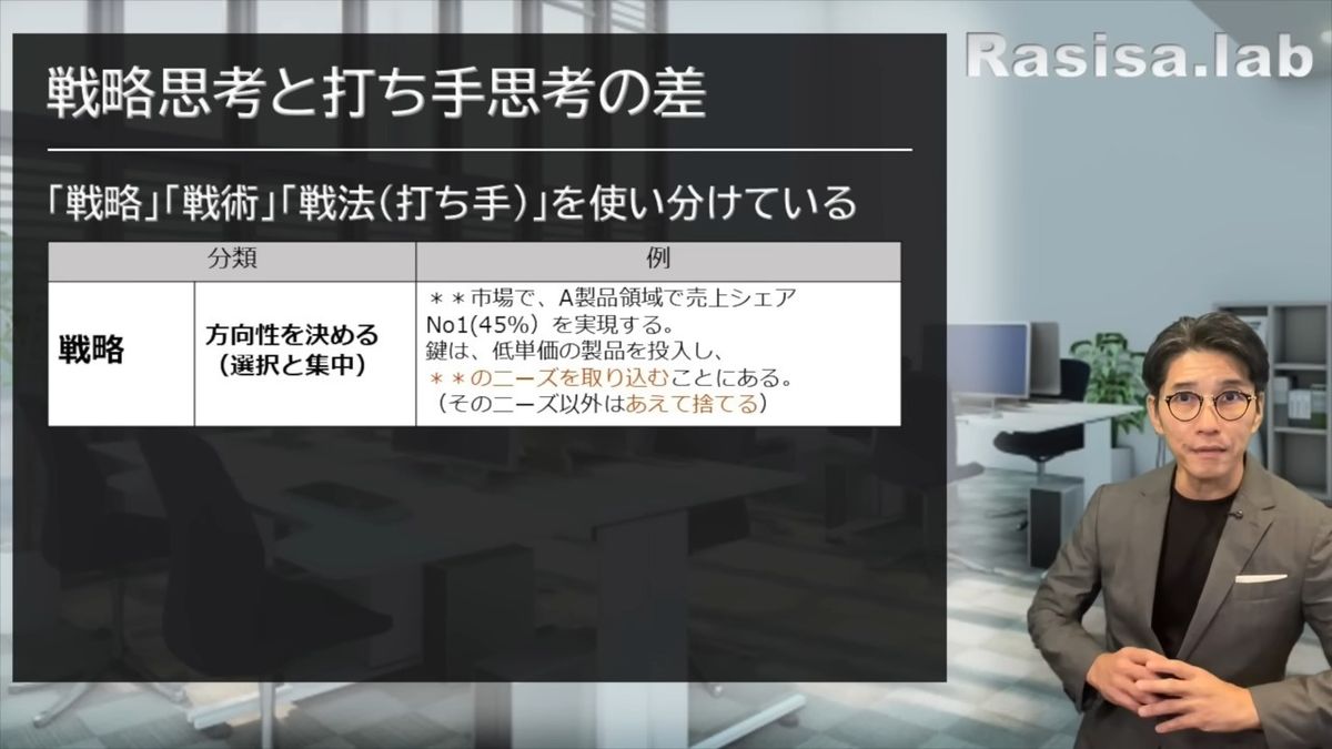 戦略思考であればそうはなりにくいんですね。戦略発表の場で打ち手の話をしちゃうと評価を下げてしまい、「この人、大丈夫かな?」になっちゃうわけです。