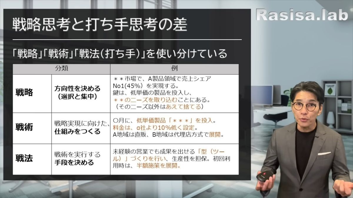 戦略、戦術、戦法。これは打ち手ですね。打ち手を使い分けて考えられているかどうかが大きなポイントです。