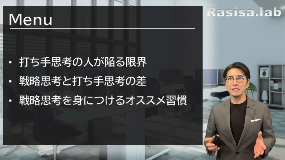 (画面を示して)メニューはこちらです。打ち手思考の人が陥る罠。そして戦略思考と打ち手思考の人の大きな差。そして最後に、誰もが戦略思考を簡単に身につけるためのテクニックを紹介していきます。楽しみにしていてください。