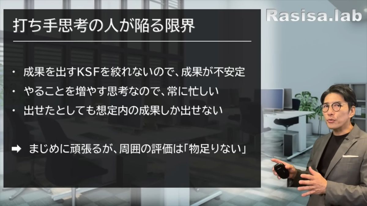 打ち手思考の人が陥る罠は、こういうことです。成果を出すKey Success Factor、つまりKSFを絞れないので、成果が安定しません。結果的にやることを増やす思考なので、常に忙しいです。成果を出せたとしても想定内か、それ以下の成果なので「いやぁ、なんかイマイチだよね」になっちゃう。