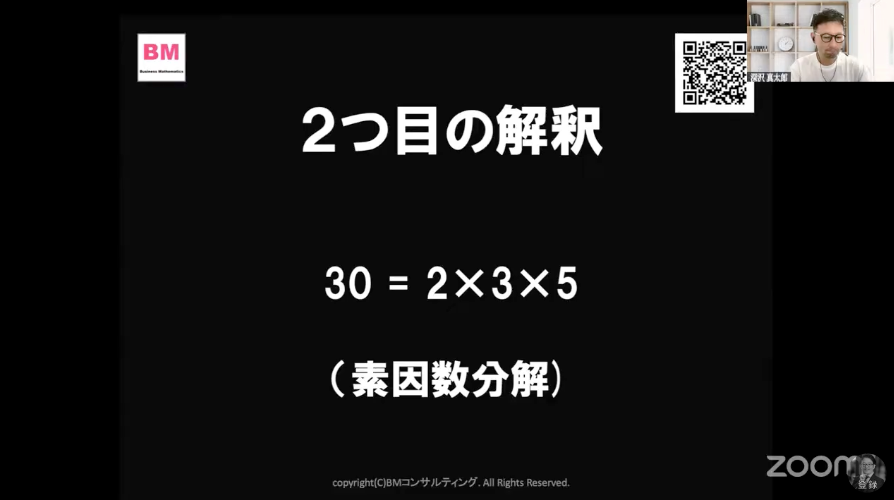 「2つあるよ」と申し上げたので、もう1つあるんですよね。別の解釈についても、ちょっとご紹介したいと思います。もしかしたらみなさんはこっちのほうが、しっくり来たりするかもしれないな。例えばですけど、これは小学校ぐらいでやったんですかねぇ。素因数分解なんてありましたね。