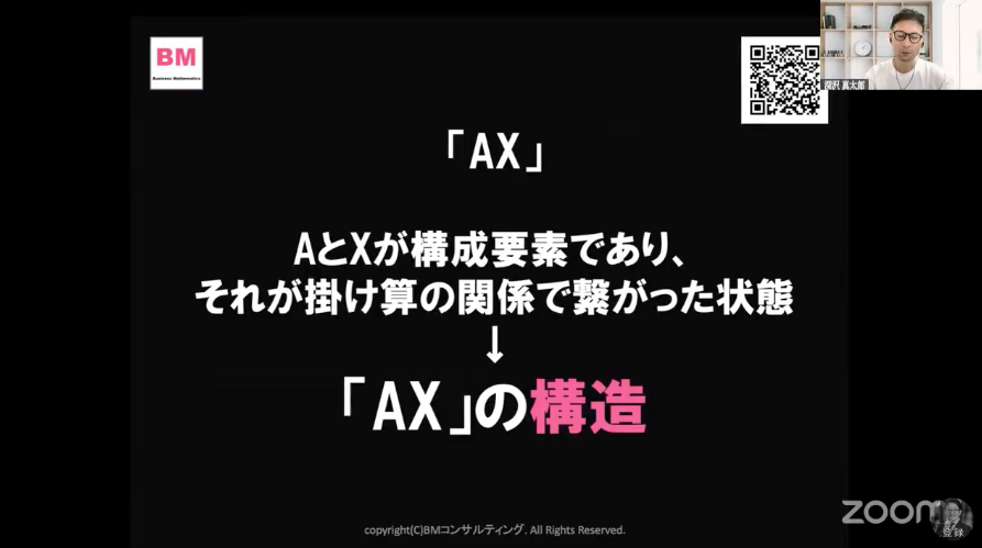 大事なことだから、もう1回言いますね。2つの構成要素があって、それがこういう関係でつながっているということです。これがAXですね。何を言っているかというと、AXというものには構造があり、その構造は私が申し上げた文章で説明できる。ここまで、いかがでしょうか?