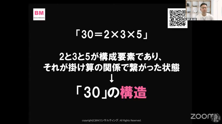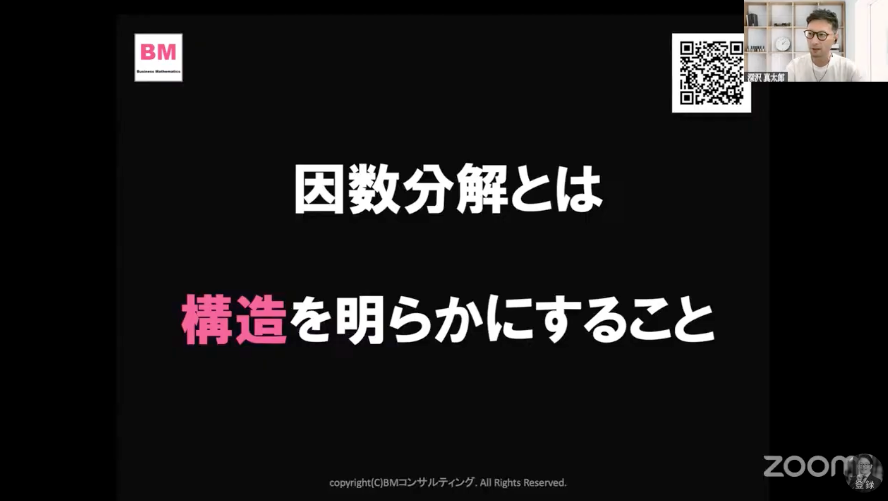 あえてこの言葉を使いますが、それは間違いです。その認識は、因数分解ではありません。因数分解は、構造を明らかにすること。私はこれが正しい理解だと指導しています。結果として数字を扱うこともあるかもしれない。売上を細かく分解することもあるかもしれませんが、本質はこれなんですね。