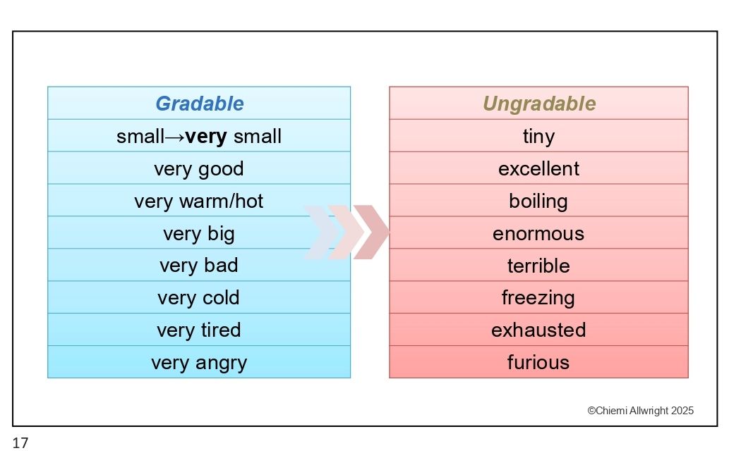 もう1個、形容詞が苦手な理由があります。(スライドの)Gradableとは何を言っているのか。グレードとはグレードアップなどの程度のことです。smallはvery smallと言って、もっと程度を上げることができます。なんでもveryをつければいいんです。