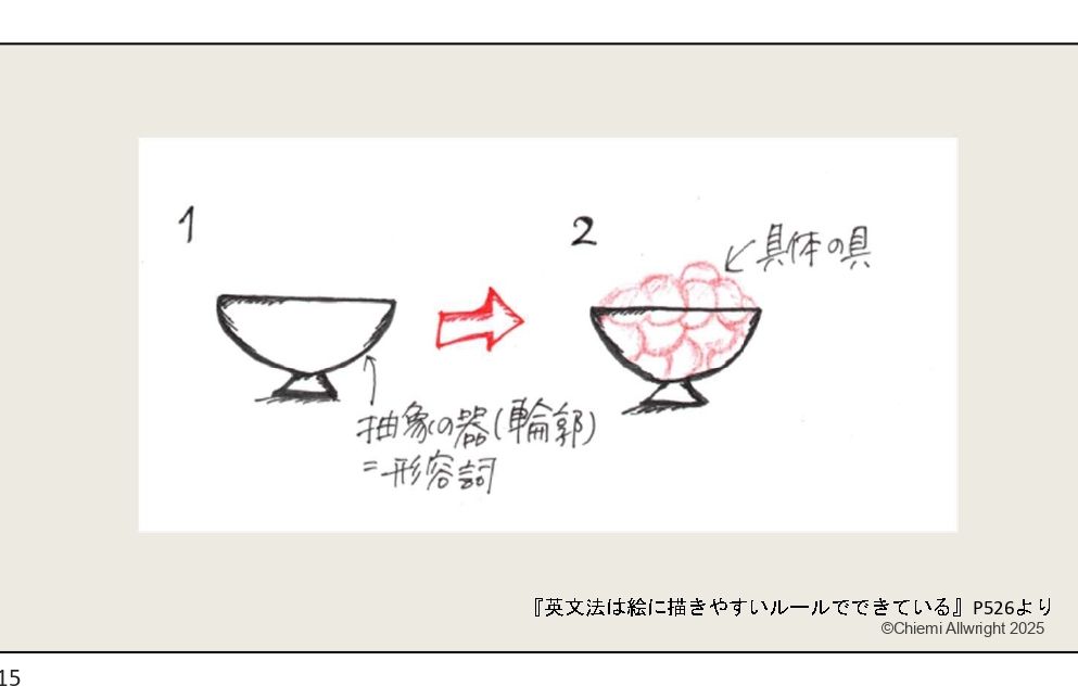 オールライト:これ(スライド)はこの本(『英文法は絵に描きやすいルールでできている』)の526ページに描いてある絵です。形容詞は器だと思ってください。形容詞は、形がある器に具(具体)をそのまま入れて、ギュッとしてくれます。英語はこれがすごく得意なんですね。