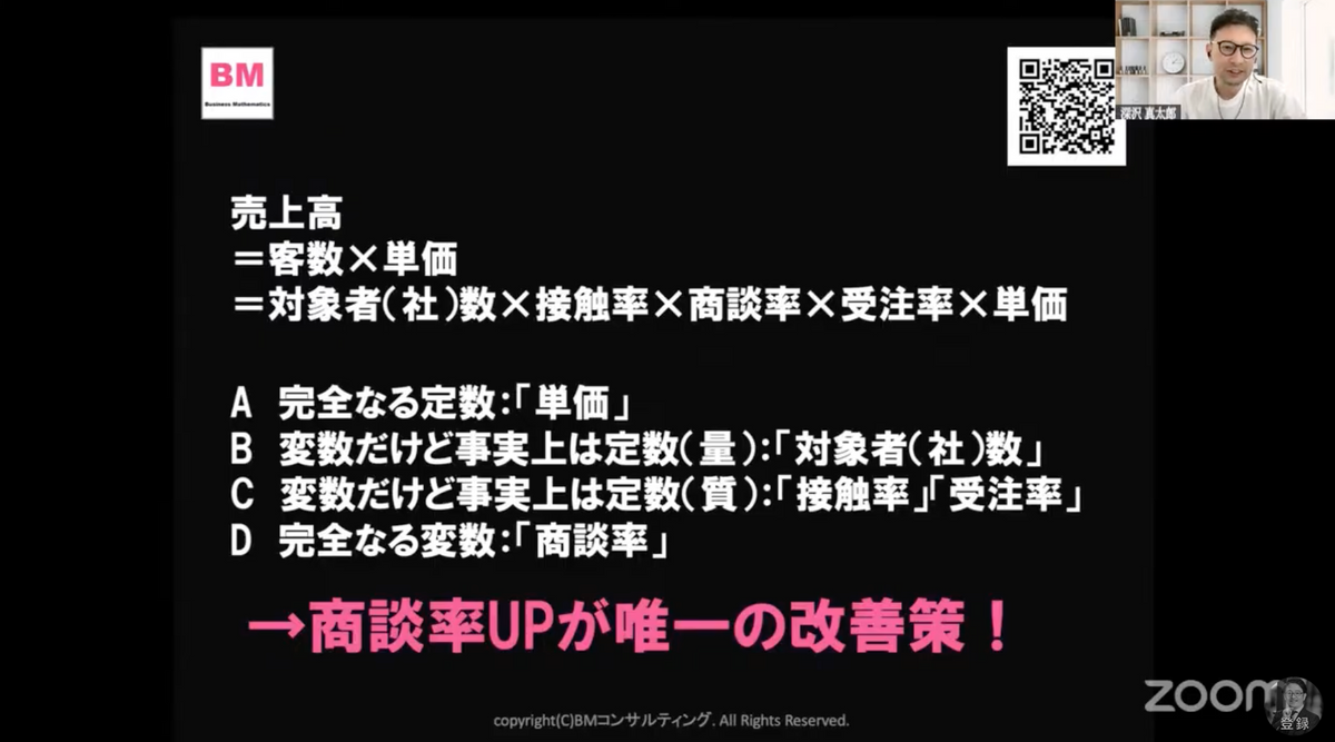 例えば今回のケース。完全なる定数を単価だとしましょう。「いやぁ、もううちの会社は社長が単価を決めているんで変えられないんです」みたいなこともあると思うんですよね(笑)。だとすれば、どんなにがんばっても変えられないので、これが定数です。そこは考えてもしょうがない。