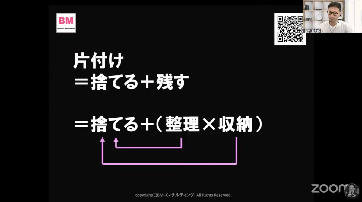 お伝えしたいのは、片付けを因数分解するというのは、こういうこと。こんな考え方をすることによって「片付けに必要なものは何?」「何がどうなれば、片付けはうまくいく? うまくいかない?」。こういったことを見つけていくことができるんですね。