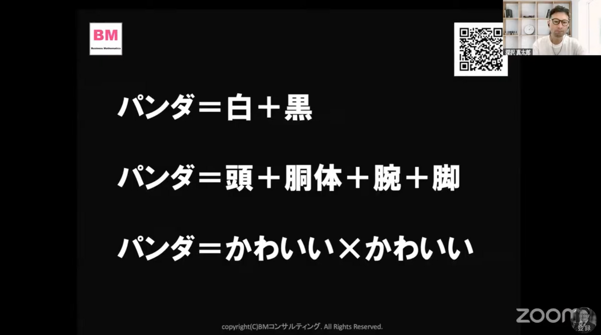 でも先ほどの構造って話が理解できていると、パンダを因数分解できるんですよ。例えばですけども(スライドを切り替えて)……みたいな感じ。もちろん、正解はありません。柔軟な発想でいろいろな分解ができる。これが因数分解なんですね。これは実際の企業の研修の時に、参加者の方々が答えてくれた内容です。どうですか。どれも間違っていないですよね。