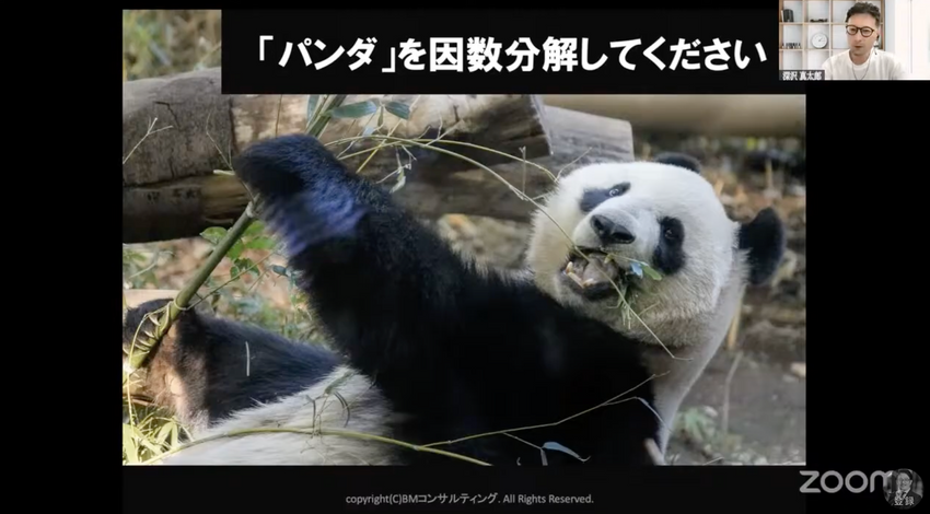 みなさん、パンダを因数分解してください。「ちょっと何言っているかわからない」っていう感じかもしれませんけれども(笑)。でも私、大まじめにやるんです。なぜかというと、先ほどの「構造化することなんだよ」っていうことがわかっていないと、「意味がわからない」という反応になるからです。