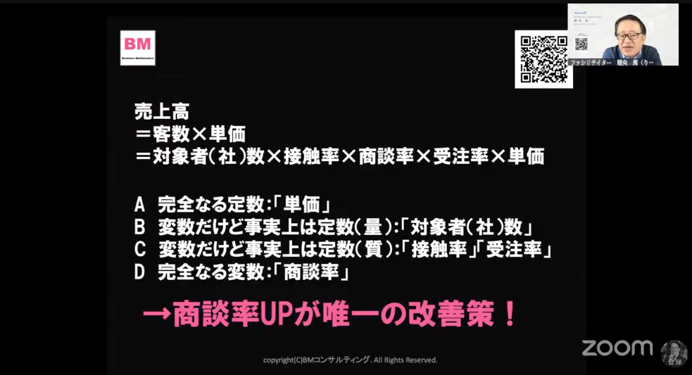 例えばみなさんが部下の方に指導をする時とか。なんでかというと、先ほど深沢さんが言っていた、売上の因数分解があったじゃないですか。もしよかったら、そのスライドをもう1回出してもらってもいいですか?