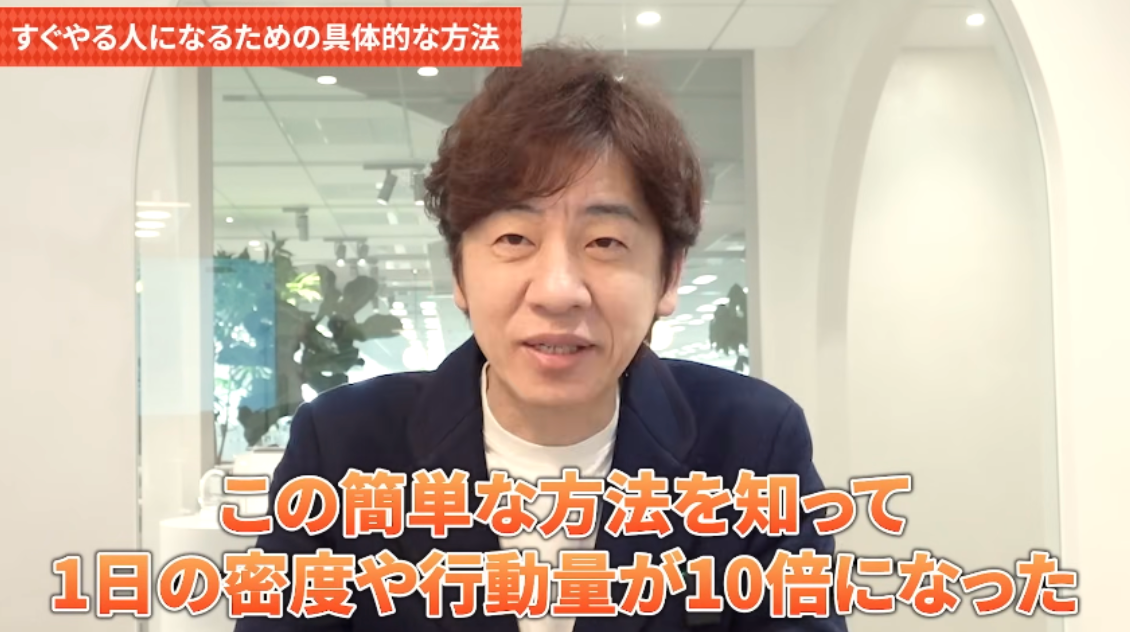 今日はこの悩みを一発で解決できる、「すぐやる人」になるための具体的な方法を紹介したいと思っています。私は上場企業の社長として、経営に関する仕事から、現役のマーケターとして地道な現場の業務もしています。日々膨大な仕事量をこなしていますけども、この簡単な方法を知っていることで、1日の密度も行動量も10倍になっています。
