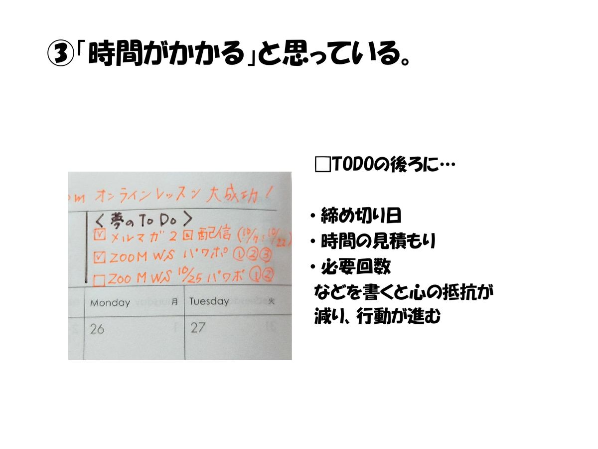 さとうめぐみ氏:それでは、先延ばしにする心理③の「時間がかかると思っている」の解決方法です。ToDoとして書いても保留にしたり先延ばしにしちゃうということだと思うので、その場合は締め切り日を書くとか、時間の見積もりをする、必要回数などを書くと、心の抵抗が減って行動が進むんです。