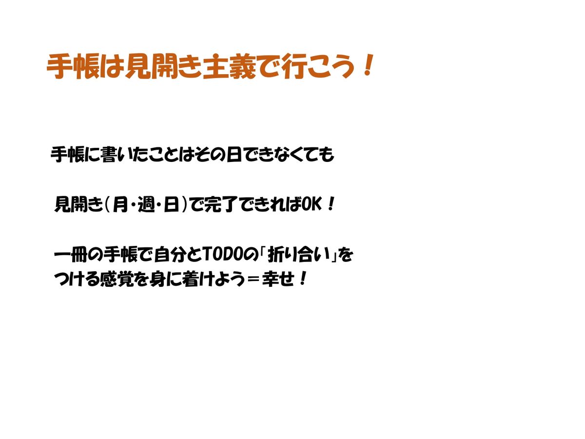 1冊の手帳で自分とToDo、やることの折り合いをつける感覚を身に付ければいいですよ。今日できなかったけど今週できたからいいやっていう折り合いのつけ方を自分でできるようになると、「あっ、幸せだな。自分のことを信じられるな」って思えるようになります。