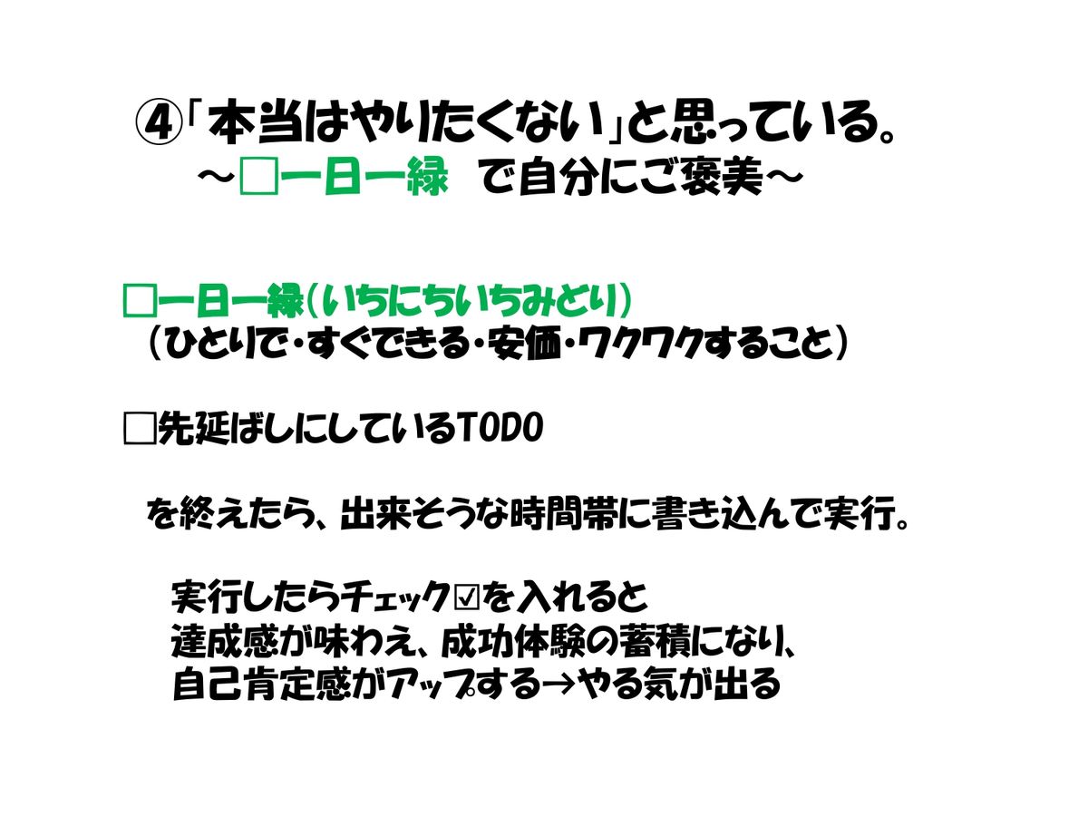 こんなふうにすると、暑い中宅急便を持っていくの嫌だなって思っても先延ばしにせず、アイスクリームをご褒美にすることで「やろう」という気持ちになります。あなたの場合は、その先延ばしを完了させたらどんな一日一緑をあげたらいいか考えてみてください。