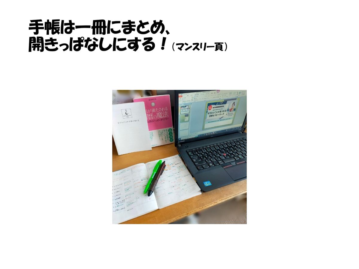 私の場合は、このようにパソコンを置いていて、右手でマウスを使うため、ちょっと手帳を置くスペースがないのですが。左側にこのように置いてあって、思いついたらすぐ手帳に書くようにしています。全体の予定が見やすいということで、マンスリーページを開いておきます。