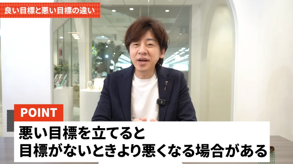 木下社長! 視聴者さんから相談がきました。「自分が成長できて、成果も上げられる高い目標を設定したいのですが、ついつい高く設定しすぎてしまい、達成できないことがあります。かといって、低い目標にするのも意味がないと思うので、適切な目標設定の方法と、その目標を達成する方法が知りたいです」。