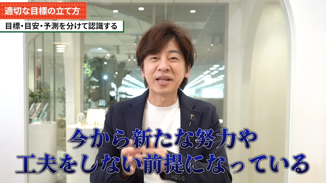 例えば「目標を立てましょう!」と言った時に、例えば「今月はこういう状態だからこれぐらいいきそうなので、目標はこれぐらいにします」って言う人がいます。これは、目標ではなくて予測です。「今の感じでいったとしたら、こうなります」という予測であって、それは新たな努力とか工夫をしない前提になっているのです。
