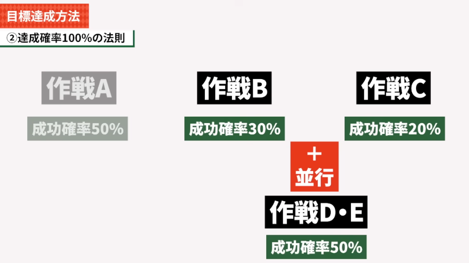 こっちのAと同じぐらいの確率のものをもう1つ用意できればいいですし。実際にはAの作戦が今考えうるベストだとすると、同じレベルのものは用意できないので、30パーセントの達成確率のBという作戦、20パーセントの達成確率のCという作戦。合わせて100パーセントになるような作戦を用意してからスタートします。